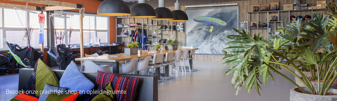 We beschikken over een prachtige opleidingsruimte, een ruime fysieke winkel waar je naar hartenlust kunt komen passen en hebben een professionele keuringsruimte voor paragliders.